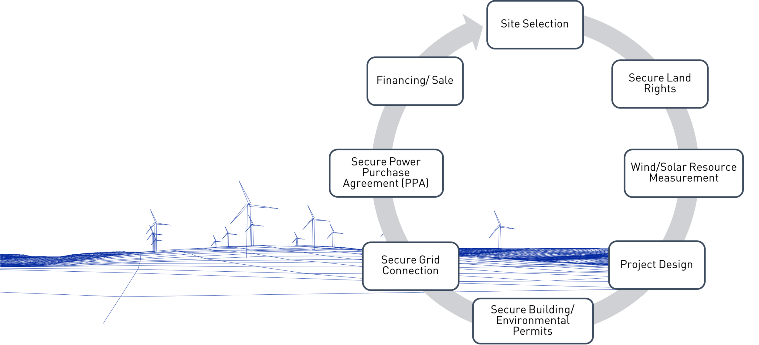 Once a project has obtained all rights and permits required to build, own and operate, it is fully developed and ready for financing and construction.